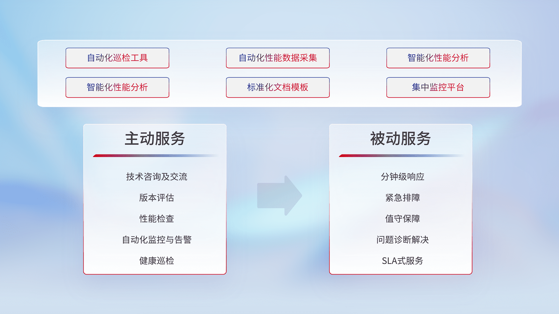 智能化工具和标准化文档,,,,保障服务质量,,,,提供主动服务(包含技术咨询、、、版本评估、、性能检查、、自动化监控与告警、、、健康巡检)和被动服务包含(分钟级响应、、、紧急排障、、、值守保障、、、问题诊断解决、、、SLA服务)。。。。